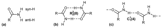 (a) Differentiation of the anti- and syn-H atom in primary amides. Classical hydrogen-bonding interactions between amide groups with the Etter notation for a ring (b) and chain (c) motif.