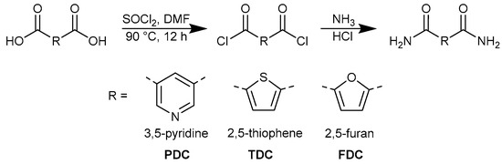 The dicarboxamides 3,5-pyridinedicarboxamide (PDC), 2,5-thiophenedicarboxamide (TDC) and 2,5-furandicarboxamide (FDC) were obtained from the respective dicarboxylic acids through transformation into the acyl chlorides followed by amidation [50]. After synthesis, the materials were authenticated and their purity assessed by 1H, 13C NMR, IR and mass spectroscopy (see Supplementary Materials, Sections S3–S5).