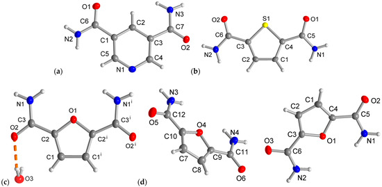 The three dicarboxamides crystallize in the monoclinic system. The molecular structures of the asymmetric unit are depicted in Figure 3. The pyridine dicarboxamides PDC have the space group P21/n, and the asymmetric unit consists of one molecule (Z = 4, Z′ = 1). The thiophene and furan dicarboxamides TDC and FDC-subl have the same space group P21/c. In FDC-solv, the space group is C2/c, the dicarboxamide crystallizes with a water molecule and both the FDC molecule and the crystal water sit in a special position of the C2 axis passing through O1 and O3. The asymmetric units of PDC, TDC and FDC-solv consist of one molecule (Z = 4, Z′ = 1), but in the asymmetric unit of FDC-subl, two crystallographically independent forms are found (Z = 8, Z′ = 2). It is also worth mentioning that the unit cell volume of FDC-subl (V = 1375 Å3) is relatively large for this type of molecule. In contrast, the cell volumes of TDC (V = 691 Å3), PDC (V = 700 Å3) and FDC-solv (V = 742 Å3) are comparable.