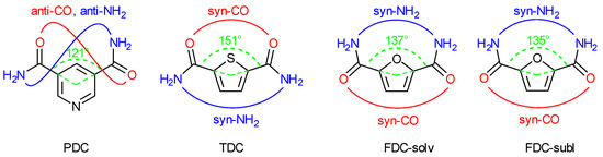 Unlike the pyridine N-atom in PDC, neither the S-atom in TDC nor the O-atom in both FDC structures become involved in the hydrogen bond network. Yet, the higher negative charge density at the furan-O atom compared to the thiophene-S atom may be responsible for the orientation of both NH2 groups on the side of the furan-O atom in FDC, whereas the NH2 groups in TDC are oriented away from the S-atom.