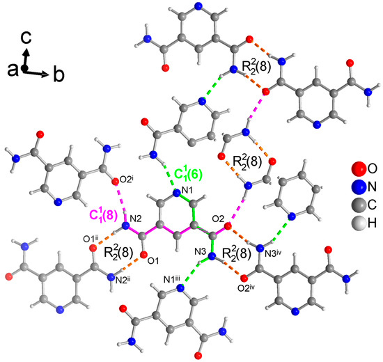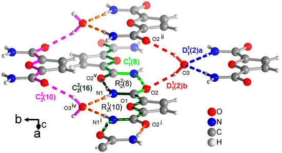 The crystal structure of PDC consists of molecules held together by hydrogen-bonded rings (Figure 5). Both symmetry independent amide groups form these rings and in both cases to their inversion-symmetric counterparts. The N-C and/or C=O bond of these rings coincide with either the chains or with both and chains. The latter are the two shortest chains in the structure of PDC (longer ones from level 2 are not discussed here). The chain includes ⋯Npyr-C-C-C-N-H⋯. The chain runs along ⋯O=C-C-O-C-C-N-H⋯. These chains involve the anti-H atoms of the NH2 groups, with the cis-H atoms being engaged in the rings.
