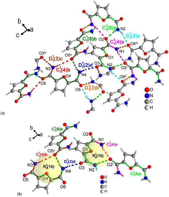 Section of the packing diagrams of FDC-subl with graph-set pattern. (a) Mercury analysis with level 1 graph-sets dissects the H-bonding network into finite patterns (differentiated as a, b, c, d given in cyan, orange, brown and blue, respectively) and two different chains (a—magenta, b—red) and chains (a—light green, b—dark green). Some molecules have been truncated to avoid overlay. (b) Highlighted rings as part of the level 2 graph-sets with the rings being also part of the chains segments noted under (a). Symmetry codes: (i) −x + 2, y − 1/2, −z + 1/2; (ii) x, −y + 1/2, z − 1/2; (iii) −x + 2, −y + 1, −z + 1; (iv) −x + 1, y + 1/2, −z + 3/2; (v) x, −y + 3/2, z − 1/2.