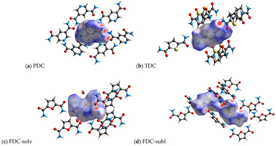 3D Hirshfeld surface representation of the dicarboxamides plotted over dnorm (a) PDC, (b) TDC, (c) FDC-solv and (d) FDC-subl.