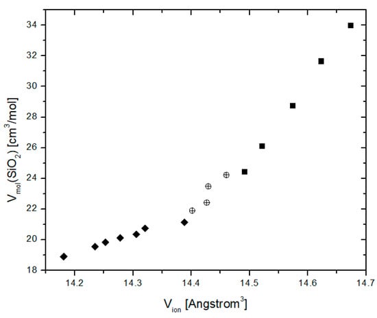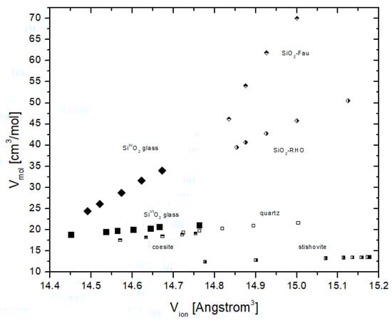 Correlation of pressure-dependent ionic and molar volumes of silica. Filled symbols: vitreous silica; hollow and half-filled symbols: crystalline polymorphs of silica. Ionic volumes are calculated based on Equation (2) for the proper bond coordinations. Molar volumes of vitreous silica are from []; the data for the crystalline polymorphs are taken from []. ‘Fau’ and ‘RHO’ stand for the faujasite- and ‘rho’-type zeolite silica frameworks.