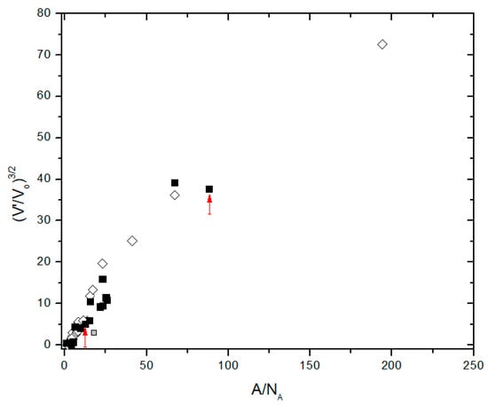 Relation between the slope A of the Vion-Vmol correlations for vitreous and crystalline materials; black squares: vitreous materials; hollow diamonds: crystalline phases. The relation between A and (V’/V0)3/2 is based on Equation (3) that was derived in []. The data for crystalline phases are taken from []. The data for vitreous materials are from this paper using molar volumes from refs. [,,,,,,,]. Gray squares represent tests for the correlation between A and the bond coordination: they give A and V’ for high-density vitreous silica but with intentionally chosen incorrect coordination IV and II for Si and O (see lines 191–200). Red arrows points to the corresponding values of A and V’ for the proper coordinations VI and III for dense and IV and II for low-density vitreous silica with A/NA = 12.3, (V’/V0)3/2 = 5.10) and A/NA = 88.0, (V’/V0)3/2 = 37.7, respectively. This shows that the relation between A and (V’/V0)3/2 is sensitive to bond coordination. Thus, wrong coordination gives values that are distinctly off the general relation.