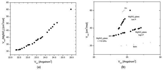 Relation of ionic and molar volume for vitreous MgSiO3. (a): Vion with fixed coordination MgVI, SiIV, OII, indicating the relative change in the Vion-Vmol relation and the regimes of linearity of different actual bond coordinations. (b): Vion-Vmol for the experimentally proposed bond coordinations. The relations for enstatite and bridgmanite are shown for reference. As in the case of silica, vitrous MgSiO3 is generally more compressible than crystalline reference phases. The actual coordination of the vitreous phases in the low- and high-pressure regime are described in the Section 4. Molar volumes were taken from [], pressure-dependent ionic volumes based on Equation (2) with pressure-dependent radii from []. Vion-Vmol relations of bridgmanite and enstatite were taken from [].