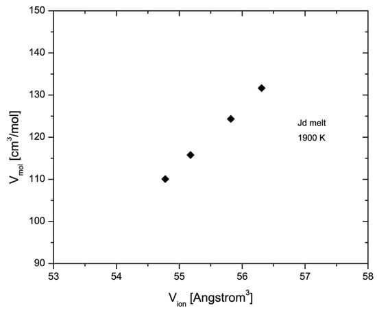 Relation of ionic and molar volume for molten NaAlSi2O6. Vion was calculated for NaVI, AlVI, SiIV, and OIII. The relation is linear, and consistent with rather constant bond coordinations over this range of isothermal volumes. Molar volumes of molten NaAlSi2O6 are taken from []; ionic volumes calculated with Equation (2) are based on pressure-dependent crystal radii from [].