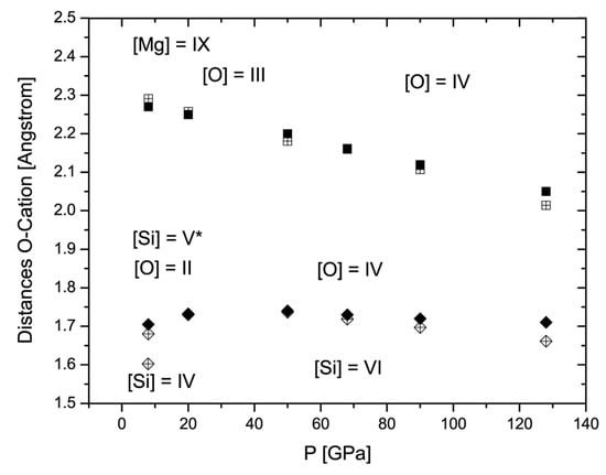 Interatomic cation–anion distances in compressed vitreous MgSiO3. Black diamonds: Data from Kim et al. []. Hollow diamonds: Calculated based on pressure-dependent crystal radii []. The bond coordinations that were used for the crystal radii are shown. The change in bond coordination in the compressed glass is reproduced by the crystal radii model.