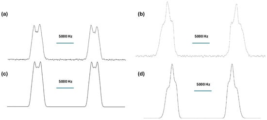 As a consequence of this macroscopic orientation, 2H NMR spectra in the SmA phase are relatively simple, as for each type of deuteron the signal is characterized by a large doublet due to the quadrupolar interaction, which can be further split, in the simplest case, into a small doublet if the 2H nucleus is coupled with a 1H. This simplest case is observed for the 11EB1M7-d2 mesogen, deuterium labeled on the phenyl ring, and an example of experimental and calculated 2H NMR spectra recorded at 7.05 T is shown in Figure 1a,c, respectively [58].