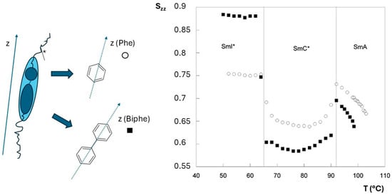 In the case of the 11EB1M7 smectogen, the main orientational order parameters, Szz, for the two aromatic components of the rigid core can be obtained from the analysis of 2H NMR spectra and their temperature behavior in the SmA, SmC*, and SmI* phases, as shown in Figure 2. Focusing on the SmA phase, the 11EB1M7 smectogen shows the typical trend of the main orientational order parameter, which increases by decreasing the temperature, remaining in the range of 0.6 to 0.75, which is rather typical of the SmA phase [47,49,57,60]. In addition, it is clear from Figure 2 that the two moieties, the phenyl and the biphenyl ones, experience a different value of the main order parameter, thus reflecting a different average orientation with respect to the phase director. As reported in ref. [58], by following the temperature behavior of these two local order parameters in the whole mesophasic temperature range, it is possible to observe a change in the average conformation and orientational properties of the LC core when passing from the SmA to the SmC* and from the SmC* to the highly ordered SmI* phase. This will be further commented on in the next section.