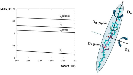 Logarithm of the diffusion constants D//, D⊥, DR (Phe), and DR (Biphe) (s−1) vs. 1000/T (1/K) of the 11EB1M7 sample in the SmA phase, derived from the analysis of the 2H NMR spin–lattice relaxation times in terms of dynamic models (see the text for details). The four rotational motions are represented on the right. Reproduced with permission from [58]. Copyright © 2003 American Chemical Society.
