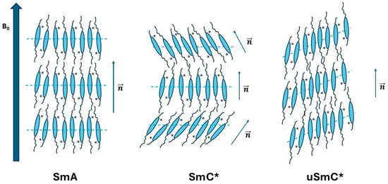 In Figure 4, the orientation of the SmA, SmC*, and unwound SmC* (uSmC*) phases with respect to an external magnetic field, B0, is represented.