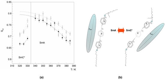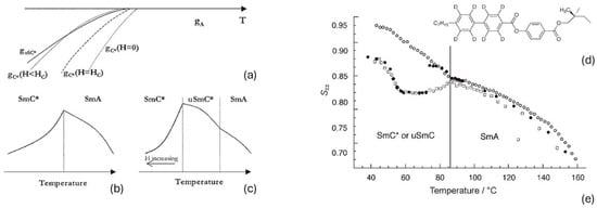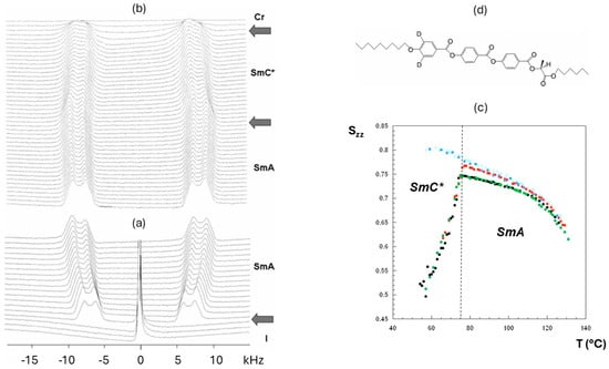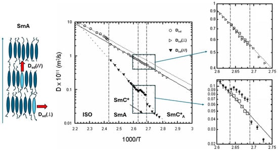 The same compound has been investigated by means of 1H NMR diffusometry [71]. The self-diffusion coefficients measured in the isotropic phase (Dsd) and for two orthogonal directions (Dsd (//) and Dsd (⊥)) in the SmA, SmC*, and SmC*A phases are reported in Figure 13.