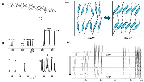 (a) Molecular structure of the 9HL sample with all carbon sites numbered from 1 to 39. (b) Assignment of most of the carbon sites of the 9HL sample of the static 13C CP NMR spectrum recorded in the SmA phase at T = 122 °C. (c) Representation of the molecular arrangement of the molecules of 9HL in the SmA and in the SmC* phase, according to the model proposed in ref. [86]. (d) Stacked 13C CP NMR static spectra of the 9HL sample acquired as a function of the temperature with an NMR instrument working at 9.46 T (temperatures decrease from top to bottom, as indicated by the black arrow). Figures are reproduced and modified with permission from [86]. Copyright © 2014 John Wiley & Sons, Inc.