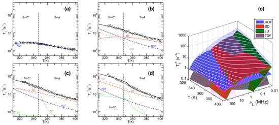 The 3D plot shown in Figure 9e helps in better visualizing the relative contributions of the relaxation mechanisms to the 1/T1 dispersions and temperature dependencies [93] in the two mesophases. From the plot, it is possible to see the frequency and temperature regions where a dynamic mechanism is most prominent. For instance, in the high-frequency range (from 5 MHz to 100 MHz), the molecular reorientation motion (ROT) is the most important dynamic process, in agreement with other studies based on the analysis of 2H NMR spin–lattice relaxation times both in the SmA and SmC* phases [94,95]. In the low-frequency range (from 100 kHz to 5 kHz), the smectic layer undulation (LU) is the most prominent dynamic mechanism in both smectic phases. However, in the intermediate-frequency range (from 5 MHz to 100 kHz), at high temperatures in the SmA, the main dynamic process is the translational self-diffusion (SD), while at low temperatures in the SmC*, the in-layer tilting direction fluctuation (TDF) is the most important process. Moreover, the discontinuities in the white lines, which correspond to lines of constant 1/T1 values, provide evidence for what happens from the dynamic point of view close to the SmA–SmC* phase transition. The occurrence of ‘TDF’ motions at intermediate frequencies already in the SmA phase is coherent with the formation of clusters of tilted LC molecules with the same azimuthal angle, thus confirming the validity of the proposed ‘cluster cone model’ to describe the molecular arrangement in the SmA formed by ‘de Vries’ LCs [93].