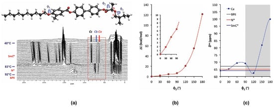 This behavior is due to the total unwinding of the helical structure in the SmC* phase of the M10/** sample, thus indicating that for this mesogen, the operating NMR magnetic field of 9.4 T is higher than the critical field. The research is focused on the interpretation of the trend of the signals in the region from 50 to 100 ppm, which corresponds to the signals of the alkoxylic carbons Ca, Cb, and Cc (see Figure 10a). With respect to other 13C signals, the observed chemical shift of these carbons changes abruptly at each phase transition, while it remains almost constant within each mesophase. To understand these trends of the 13C NMR chemical shift, detailed DFT calculations of the potential energy surfaces and of the 13C NMR isotropic chemical shifts have been performed [96]. In particular, a conformational study was performed, and the chemical shift tensors of the three carbons (Ca, Cb, and Cc) were determined through DFT calculations. The most populated conformers of the M10/** compound in the three phases were identified by comparing the observed chemical shift with the computed chemical shift. In this step, an approximation was introduced; we have assumed that the chemical shift anisotropies are negligible, thus identifying the observed chemical shift measured in the static 1H decoupled 13C CP NMR spectra with the theoretical isotropic chemical shift (δ = δiso). For the three mesophases, a unique set of the dihedral angles φ1, φ2, and φ3 (defined in Figure 10a) was identified, and an average conformation of the M10/** compound was determined. For simplicity, the conformational energy, ∆E (kcal/mol), as a function of the dihedral angle φ1 relative to the carbon Ca is reported in Figure 10b. The plot clearly shows that the most stable conformation for Ca is obtained for φ1 = 0°; in fact, ∆E increases with the increase in the dihedral angle from 0° to 180°. The conformations with φ1 > 90° have very high energy. Interestingly, DFT calculations indicate that the chemical shift of the carbon on the achiral chain (Ca) is very sensitive to the dihedral angle φ1. As seen in Figure 10c, the region marked in grey indicates that the values of the dihedral angle between 90° and 180° can be excluded, as they correspond to high energy (6 kcal/mol < E < 120 kcal/mol). By considering the temperature range of stability of the three mesophases, from 25° to 125 °C, these values of the dihedral angle correspond to about 0% population and very distorted molecular geometries. Similar procedures were performed for the dihedral angles φ2 and φ3. In these cases, two intervals, namely, 120–180° for φ2 and 150–180° for φ3, can be excluded as they correspond to high energy and a low population. In Figure 10c, the calculated values of the chemical shift, δiso, are superimposed onto the three values of the observed chemical shift, δ, in the three mesophases. The intersection between the calculated and experimental curves allowed us to identify the average conformation in the three phases [96]. In conclusion, the study demonstrated that the M10/** sample undergoes to a conformational change concerning the lateral aliphatic moieties at the two phase transitions. In particular, the achiral chain reduces its degrees of freedom by decreasing the temperature, while the chiral chain assumes different stable conformations and, as a consequence, the overall molecular shape of the M10/** is different in the three different mesophases. Moreover, from the analysis of the 13C NMR chemical shift anisotropy in the ferroelectric SmC* phase, the local orientational orders, Szz and Sxx-Syy, could be determined, showing a molecular biaxiality that was rather large, which is in agreement with other studies on several ferroelectric LCs [48,88]. The present investigations confirm that in the SmC* phase, the overall molecular shape is bent and not linear as in highly ordered mesophases. As a main result, the study supports the hypothesis of a conformational change of the mesogens at the origin of the properties of the ferroelectric SmC* phase.