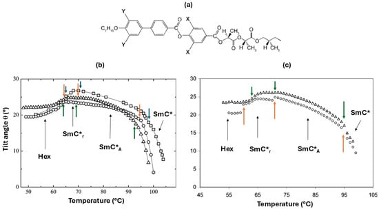 (a) Molecular structure of the ZLL7/* (X = Y = H) and the two isotopomers ZLL7/*-phe-d2 (X = D, Y = H) and ZLL7/*-biphe-d2 (X = H, Y = D). (b) Temperature dependence of the spontaneous tilt angle measured optically upon cooling for ZLL 7/* (empty squares), ZLL 7/*-phe-d2 (empty circles), and ZLL 7/*-biphe-d2 (empty triangles). (c) Tilt angle of the two labeled ZLL 7/* compounds vs. temperature based on the 2H NMR study. Triangles and circles refer to ZLL 7/*-biphe-d2 and ZLL 7/*-phe-d2, respectively. The experimental error is lower than 3%. Vertical colored arrows indicate the temperature transitions for ZLL 7/* (blue arrows), ZLL 7/*-phe-d2 (orange arrows), and ZLL 7/*-biphe-d2 (green arrows). Adapted with permission from [60]. Copyright © 2006 American Chemical Society.