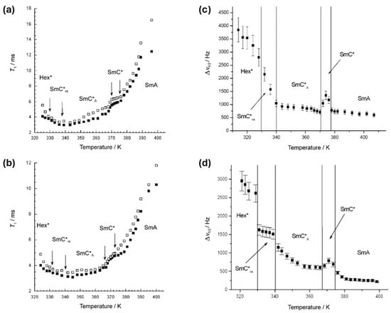 Further information concerning the dynamic processes active in the different mesophases can be obtained from the trends of the experimental 2H NMR spectral linewidths, ∆νh/2, as well as from those of the spin–spin relaxation times, T2 [94]. Figure 12 shows the spectral linewidths obtained from the 2H NMR spectra recorded at 46.04 MHz for ZLL7/*-biphe-d2 (Figure 12c) and ZLL7/*-phe-d2 (Figure 12d).