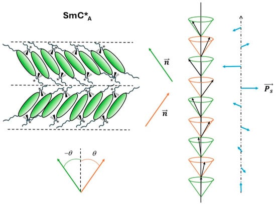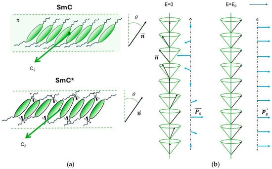 Since their discovery by Meyer et al. in 1975 [1], ferroelectric liquid crystals (LCs) have attracted the attention of both the scientific community and the industry up to the present day. The first ferroelectric liquid crystals were chiral mesogens with the typical rod-like shape (i.e., calamitic LCs) forming smectic phases [1,2,3,4]. As reported by Goodby [4], the molecular chirality induces new liquid crystalline phases, with a supramolecular structure characterized by a helical arrangement of molecules. Molecular chirality thus induces local structural asymmetries, which reflect the peculiar organization of LC molecules in the different mesophases [5]. The ferroelectric smectic phase, called the SmC* phase, is analogous to the achiral SmC phase, where the local phase director, n, is tilted by an average tilt angle θ with respect to the normal layer. In the case of the achiral SmC phase, the symmetry of the phase is C2h, with a two-fold axis, a mirror plane, and a center of inversion as symmetry elements (see the representation in Scheme 1a). In the SmC* phase, the presence of chiral molecules (right- or left-handed ones) breaks the symmetry, and the only symmetry element is the C2 axis, thus reducing the symmetry of the phase from C2h to C2. This symmetry property is at the origin of several peculiar properties of the SmC* phase, such as the ferroelectricity [1,2,3,4,6,7]; in fact, each smectic layer has a spontaneous polarization, Ps. As shown in Scheme 1b, the supramolecular helical distribution of the phase director corresponds to an analogous distribution for the spontaneous polarization along the helical axis (see the light blue arrows). Within a helical pitch, the polarization averages to zero. However, if an electric field, E, is applied perpendicularly to the helical axis, a net macroscopic polarization is observed due to the unwinding of the helix. This phenomenon is at the basis of several technological applications of the SmC* phase [1,2,3,4,7,8,9], such as the ferroelectric liquid crystal displays based on the surface-stabilized ferroelectric liquid crystals (SSFLCs) [8,9].