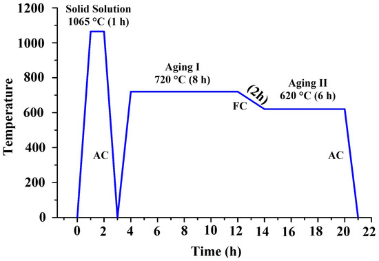The samples produced via the SLM underwent heat treatment: solid solution at 1065 °C for 1 h with air cooling (AC), followed by double aging at 720 °C with furnace cooling (FC) at 620 °C for 8 h and 6 h, respectively. Air cooling was conducted for 8 h following that. Figure 2 illustrates the solid solution + aging heat treatment cycle of the In718 samples.