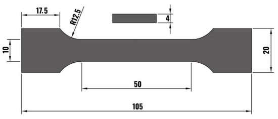 Tensile tests were conducted at room temperature using an Instron 5985 Universal machine (Ulm, Germany) following the TS-EN-ISO-6892-1 standard method A. The crosshead speed was 5 mm/min. Three samples were repeated for each parameter. Figure 4 shows the dog-bone-shaped tensile test sample according to ASTM E8.