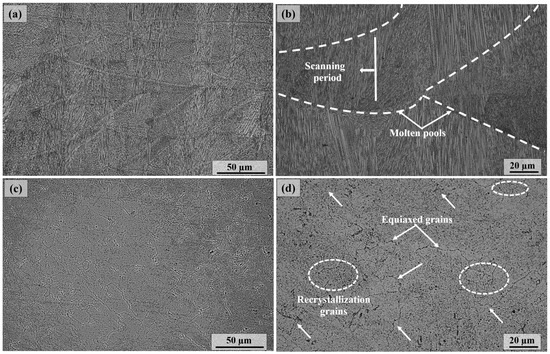 As a result of rapid solidification, cracks and defects are typically encountered during the SLM process; however, neither the as-built nor the HT samples exhibited any cracks, indicating that the AM processing parameters are appropriate. Molten pools are distinguishable within the internal structure of the as-built sample, as illustrated in Figure 6a,b. Additionally, a greater number of equiaxed grains (as shown by white arrows in Figure 6d) are observed as a result of the solid solution temperature of 1065 °C surpassing that of the recrystallization temperature (approximately 1025 °C) [36]. New grains eventually nucleated and grew within the grain, replacing the coarse columnar crystals in the post-heat-treated sample shown in Figure 6c,d.