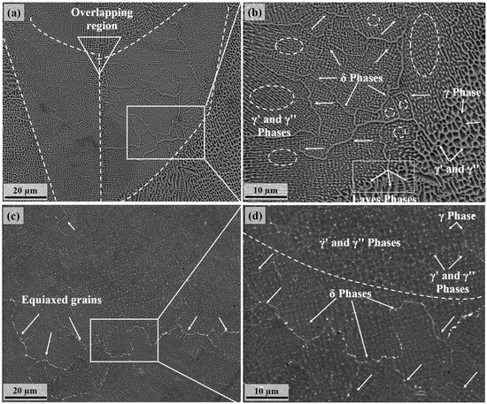 After heat treatment, the Laves phases become encapsulated within the dendrite region of the inner cells, while the delta (δ) phases precipitate at the grain boundary (Figure 7b,c). The HT sample has equiaxed grains. Its cellular dendrite structure (as indicated by white arrows in Figure 7c,d) has disappeared completely because of solid solution application and aging. Furthermore, it is evident from Figure 7d that the Laves phases dissolve rapidly, and a considerable quantity of δ phases precipitate at the grain boundary. The Laves phase undergoes partial dissolution since the heat treatment temperature of 1065 °C exceeds the solvus temperature of the δ phases. As a result, the precipitation of the δ phases is not desired following HT [40].