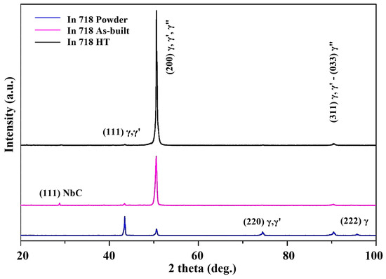 In Figure 8, the XRD patterns of In718 powder, as-built, and HT samples are illustrated to further clarify the evolution of phases within the microstructure through heat treatment. After heat treatment, strengthening γ′ and γ″ phases, which typically have a face-centered cubic (FCC) crystal structure, are visible with minimal deviation and identical lattice structure [39]. XRD patterns of γ, γ′, and γ″ are visible, as evidenced by the diffraction peaks in the (111), (200), and (311-033) planes. NbC carbide was also observed on the (111) plane with angles ranging from 25° to 30°. This can be attributed to the presence of unsolidified Nb elements during the SLM process. Furthermore, the (200) peak exhibits greater intensity in the as-built and HT samples as a result of the precipitated strengthening phases (γ′ and γ″). The γ and γ′ phases at the (220) plane phases (70–80°) disappeared subsequent to HT due to dissolution.