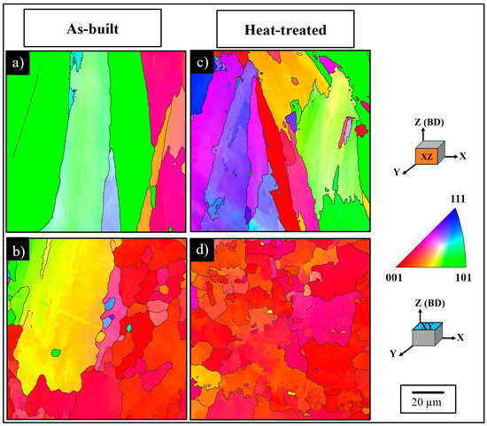 In order to further understand the evolution of texture and microstructural features following heat treatment, Figure 9 shows the IPF map of the as-built and HT In718 samples in both the XZ and XY planes. The microstructure exhibits a columnar structure resulting from epitaxial growth (Figure 9a), while the columnar structure is oriented in the <101> direction within the XZ plane, revealing that the as-built sample possesses a strong texture in the XZ plane. Following heat treatment, the columnar structure remained unchanged in the XZ plane (Figure 9c), but the grain size decreased, as also evidenced by the discussed OM and SEM images (Figure 5, Figure 6 and Figure 7). Recrystallization was caused by the heat treatment, leading to the formation of new grains in the as-built microstructure. Thus, the strong texture observed in the as-built condition transformed into a random texture following the heat treatment in the XZ plane. The reorganization of the grains led to a modification of the texture and facilitated a transition from an anisotropic to an isotropic structure. Upon analyzing the XY plane, it is observed that grains are oriented in the <001> direction in the as-built condition (Figure 9b). The grain size in the XY plane decreased following heat treatment (Figure 9d), as was observed in the XZ plane, whereas the strong texture in the <001> direction was not changed with heat treatment.