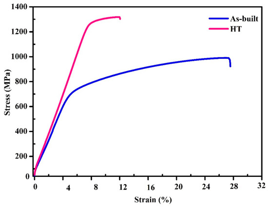 Stress–strain curves of as-built and HT samples.