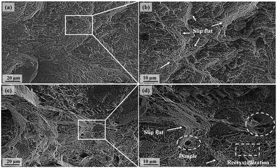 Fracture surface morphology of as-built (a,b) and HT (c,d) samples.