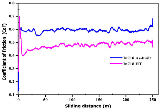 CoF vs. sliding distance for as-built and HT samples.