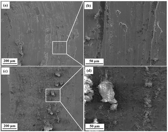 Generally, the dry contact sliding of nickel alloys, such as the Inconel series, involves multiple wear mechanisms that occur simultaneously. The worn surface morphologies of as-built and HT In718 samples are presented in Figure 13. As-built samples have spalling and fragmentation, and shear bands enlarged into cracks. Due to severe plastic deformation during wear, as-built samples have delaminated, indicating adhesive wear [63]. This phenomenon may arise from the temperature generated at their interface during the wear test [64] and also from augmented plastic strain at the contacting asperities. The HT samples exhibit micro-cutting and abrasion [47], showing lower delamination and shallow micro-scratches, indicating abrasion dominates [65]. After the heat treatment, wear debris particles of distinct sizes were produced on the worn surface (Figure 13c,d), indicating that abrasive wear is dominant. Nevertheless, it has been demonstrated that the wear of the sample after HT was minimal, characterized by fewer fine grooves and wear debris, indicating that the surface of the HT In718 alloy possesses high mechanical stability and compactness.