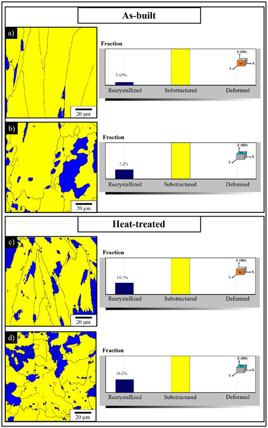 The recrystallization rate of the as-built and HT samples is shown in Figure 14. The yellow areas in the images depict the substructured grains, while the blue regions indicate the grains that have undergone recrystallization. Figure 14 also provides statistical data on the recrystallization percentages of the XZ and XY planes. The recrystallization of the XZ plane in the as-built state increased from 2.42% to 14.1% after heat treatment. Similarly, the recrystallization rate in the XY plane increased from 7.2% to 16.2% after heat treatment. Consequently, the application of heat treatment resulted in the formation of newly formed grains within the structure, leading to a reduction in grain size and a decrease in dislocation density, as also shown by IPF maps and SEM studies, respectively (Figure 7 and Figure 9).