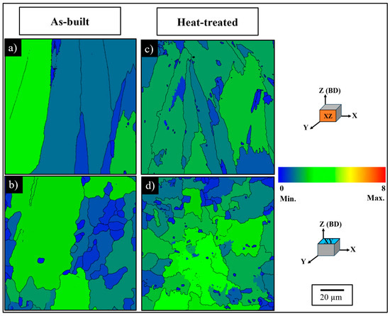 The GOS maps of In718: As-built in (a) XZ and (b) XY orientations; HT in (c) XZ and (d) XY orientations.