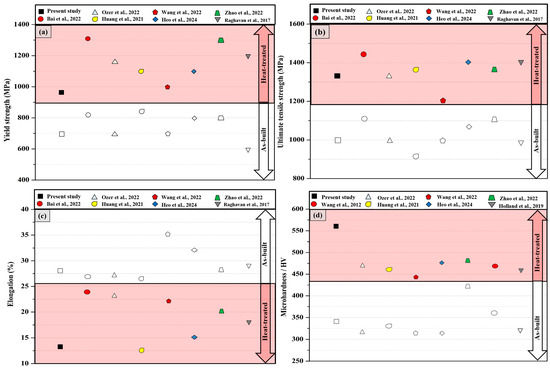 Comparison of the YS (a), UTS (b), elongation (c), and hardness values (d) obtained as a function of In718 loading with literature studies [24,31,36,57,58,59,60,61,62].