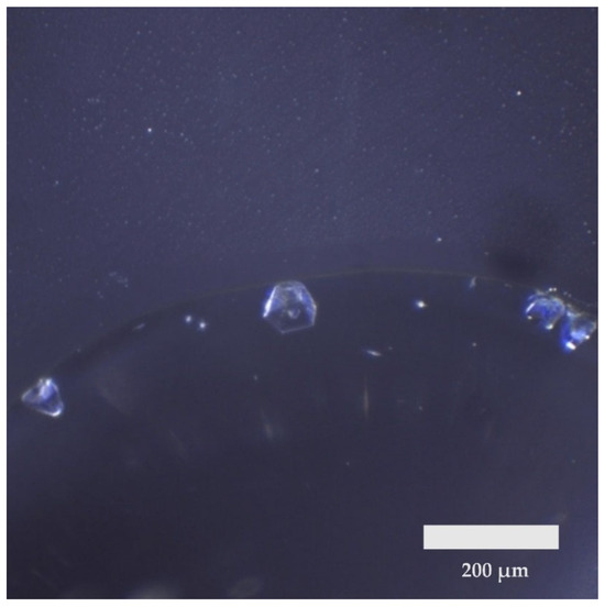 Crystals with a good quality (0.1 × 0.05 × 0.05 mm3) suitable for single crystal X-ray analysis formed within two weeks (Figure 1). Efforts to collect single crystal data have been made for various crystals at Elettra Synchrotron Trieste on the MD2s beam line utilizing microdiffraction with an approximate spot size of 5 µm. It is important that the dataset that reached a resolution of 1.9 Å was from a crystal taken from the crystallization drop two weeks after it was first observed. Crystals of comparable or even larger dimensions that were allowed to “stabilize” for more than two weeks in the crystallization drop typically diffracted at resolutions up to 2.2 Å. Efforts to collect data using the Bruker D8 Venture diffractometer were also made on several crystals; however, the quality of the resulting diffraction data was not on par with that obtained from experiments at the Elettra Synchrotron.