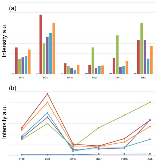 Fluorescent intercalator displacement data for 9FT8 (a) bar chart representation of intensity values of DNA-EtBr (dark red-brown), DNA-EtBr-HT1 (green), DNA-EtBr-DAPI (purple/violet), DNA-EtBr-Berenil (light blue) and DNA-EtBr-TO (orange) and (b) line chart representation of the same data to illustrating the trends across different sequences.; dark blue represents the intensity values of water-diluted DNA sequences tested alone, before the addition of EtBr.