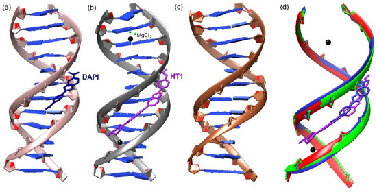 View of the asymmetric unit of (a) 5T4W including DAPI molecule, (b) view of the asymmetric unit of 9FT8 with Hoechst 33342, (c) 1D29 molecule without ligands, and (d) visualization of the superposed phosphate backbone and the ligands of 5T4W (blue), 9FT8 (in green), and 1D29 (in red).