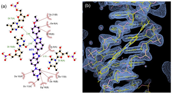 Observed interactions of HT1 with DNA. (a) Hydrogen boning interactions are shown as green dashed lines, while steric hindrance is shown as red dashed lines. (b) 2Fo—Fc electron density maps within 1.9 Å disclosing the HT1 molecule.