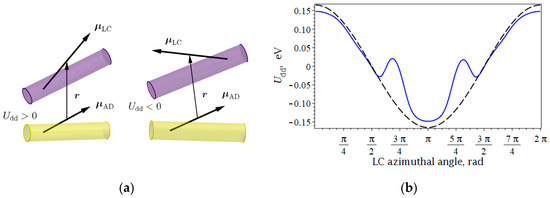 (a) Various configurations of dipole moments, providing repulsive and attractive interactions; (b) potential energy of pairwise dipole–dipole coupling versus for normally distributed LC alignment (solid curve) and perfect alignment of LC molecules (dashed curve).
