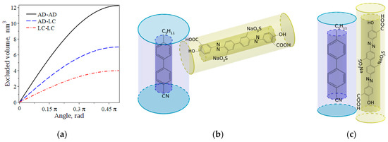 Let long molecular axes of azo dye and nematic LC molecules be represented as long cylinders; i.e., , where is the length and is the diameter. We note that steric coupling and dipole–dipole interaction are described by different principal axes defining long molecular axes , and dipole moment , which increases the complexity of our study. By adopting the Onsager theory [35,36], we can estimate the excluded volumes for steric interactions: