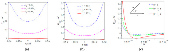 If the separation between molecular centers increases, it approaches to the critical radius , when steric interactions become vanishingly small (see Figure 4). We also note that angle does not produce any contribution to steric interactions.