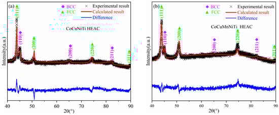 - CoCuNiTi and CoCuMnNiTi HEACs were successfully prepared on the surface of 45 carbon steel substrate. Both alloys have a dual-phase structure of FCC main phase and BCC phase. The characteristic parameters of FCC and BCC phases in both alloys were obtained by the Rietveld full-pattern fitting method. Their refinement weighting factors are 6.82% and 5.02%, respectively. The addition of Mn element causes a decrease in lattice constant and cell volume, and an increase in two-phase density and FCC phase content.
