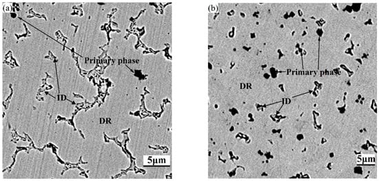 - The microstructures of CoCuNiTi and CoCuMnNiTi alloys are dendritic structures. The dendrite and interdendrite regions are composed of FCC and BCC phases, respectively. The widths of the primary dendrites of CoCuNiTi and CoCuMnNiTi alloys are about 8.10 μm and 4.11 μm, respectively. The microstructure of Mn-containing alloy is obviously refined, because the addition of Mn element with a lower melting point can not only cause the alloy melt to maintain a liquid environment for a longer period of time at the same temperature, but also improve the fluidity and diffusion rate of the alloy melt, which in turn helps to complete the nucleation and growth of the alloying elements required in a short time, resulting in a significantly reduction in the resistance of the liquid–solid interface transition.