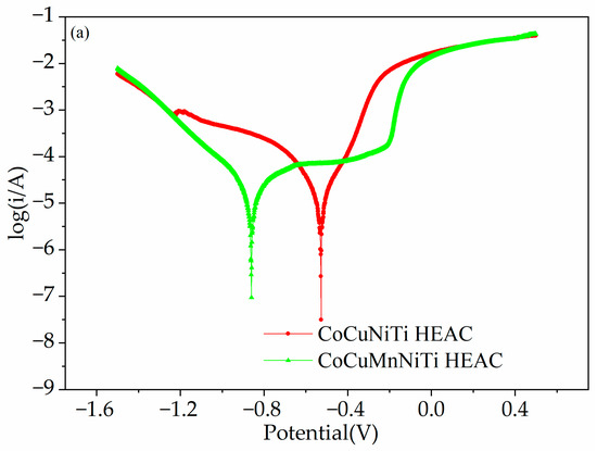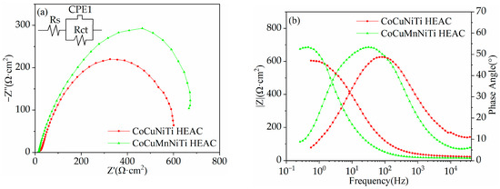 - In 3.5 wt.% NaCl solution, an obvious passivation zone appeared in the polarization curve of the alloy after adding Mn element. Electrochemical impedance spectroscopy shows that the addition of Mn element increases the capacitive reactance arc radius and maximum phase angle, indicating that the corrosion rate of CoCuMnNiTi HEAC is lower and its corrosion resistance is improved.