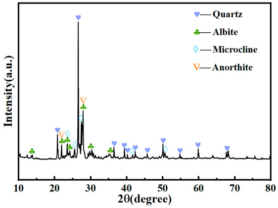 The granite waste from granite cutting and polishing was used as the main raw material. The chemical composition of the raw material was shown in Table 1. It can be seen that granite waste mainly contains 64.76 wt% SiO2 and 14.17 wt% Al2O3, with a small quantity of Na2O (3.87 wt%), K2O (4.93 wt%), CaO (3.33 wt%), and MgO (1.27 wt%). The result of crystalline phase was shown in Table 1. It is observed from Figure 1 that the major crystalline phases in granite waste are Quartz (SiO2, #01-70-3755) and Albite (Na(AlSi3O8), PDF#02-89-6426), meanwhile, phase of Microcline (KAlSi3O8, PDF#03-19-0932) and Anorthite (Ca(Al2Si2O8), PDF#04-79-1254) can be also seen in granite waste. CaO was used as the flux (CP, Sinopharm Chemical Reagent Co., Ltd. Shanghai, China), while silicon carbide (α-SiC, purity of 99%, particle size 0.5~0.7 μm, Shanghai Macklin Biochemical Co., Ltd., Shanghai, China) and MnO2 (AR, Shanghai Macklin Biochemical Co., Ltd., Shanghai, China) were used as the foaming agent. Anhydrous ethanol (AR, Purity ≥ 99.7%, Sinopharm Chemical Reagent Co., Ltd., Shanghai, China) was used as the binder.