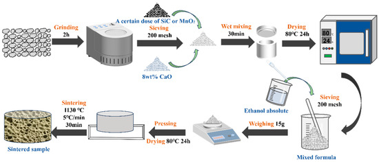In this work, the granite waste was utilized as the primary raw material with 8% CaO as the flux and different dosage of SiC/MnO2 as foaming agent. The foam ceramic was prepared via the powder sintering method with different content of foaming agent from 0–3 wt%. The preparation methodology was depicted in Figure 2. Firstly, the raw material was crushed and then sieved to pass through a screen of 200 mesh by grinding for 2 h. Subsequently, all the raw material was uniformly mixed and then dried in electric oven at 80 °C for 24 h; then the pressed cylinder green body with size of 140 mm in diameter and 40 mm in thickness was obtained. Finally, green sample was placed in muffle furnace and then heated to high temperatures in the range of 1000–1200 °C with different holding time at air atmosphere. The heating rate was 5 °C/min, and the sintered sample was cooled naturally and then cut for test.