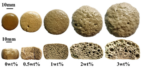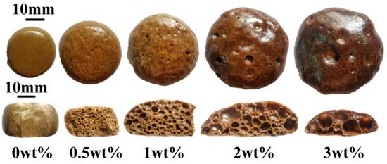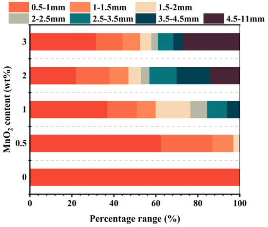 Compared to samples utilizing SiC as a blowing agent (Figure 3), samples employing MnO2 as a blowing agent (Figure 8) demonstrated an increment in pore size with increasing blowing agent content. The reaction involving SiC required O2 and thus was influenced by transmission medium. For example, insufficient oxygen content could lead to inadequate internal SiC reaction and layered foaming phenomenon during practical production processes due to susceptibility towards sintering environment. On the other hand, for MnO2 serving as a foaming agent, significant differences there existed in gas production principle compared to that involving SiC. MnO2 generated O2 through a decomposition reaction where only dosage-dependent generation occurred without occurrence of layered foaming phenomenon [28].