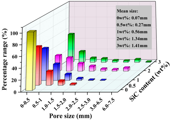 Figure 4 show the aperture distribution range and average aperture of samples with different SiC content. As the dosage of foaming agent was increased from 0.5 wt% to 1 wt%, there were a slow growth in pore size and porosity, widening of the pore size distribution, and an increase in average pore size from 0.27 mm to 0.56 mm. When the SiC content increased further from 2 wt% to 3 wt%, the pore size of the foamed ceramics increased remarkably, accompanied by the extended pore size distribution. It is noteworthy that the sample with addition 2–3 wt% SiC presented inhomogeneous pore morphology composed of the external large pores (1.3 mm~1.4 mm) and core small pores. Because SiC reacted with enough O2 in the external layer, while the O2 inflow in the core layer decreases [17], there was a reduction of gas releasing, resulting in the decrease porosity.